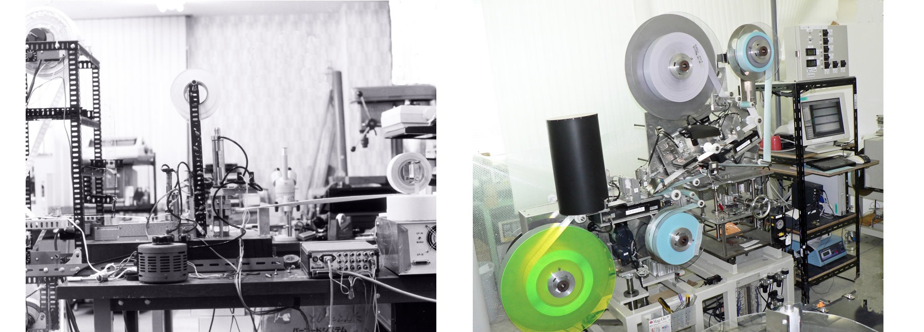 The one on the left is a ceramic label processing machine that we worked on all night for a couple of days using materials we gathered at a home improvement store, such as erasers, angles, and screw rods, to finish the machine when it was decided that ceramic labels would be used for the first time at a TV cathode ray tube factory.