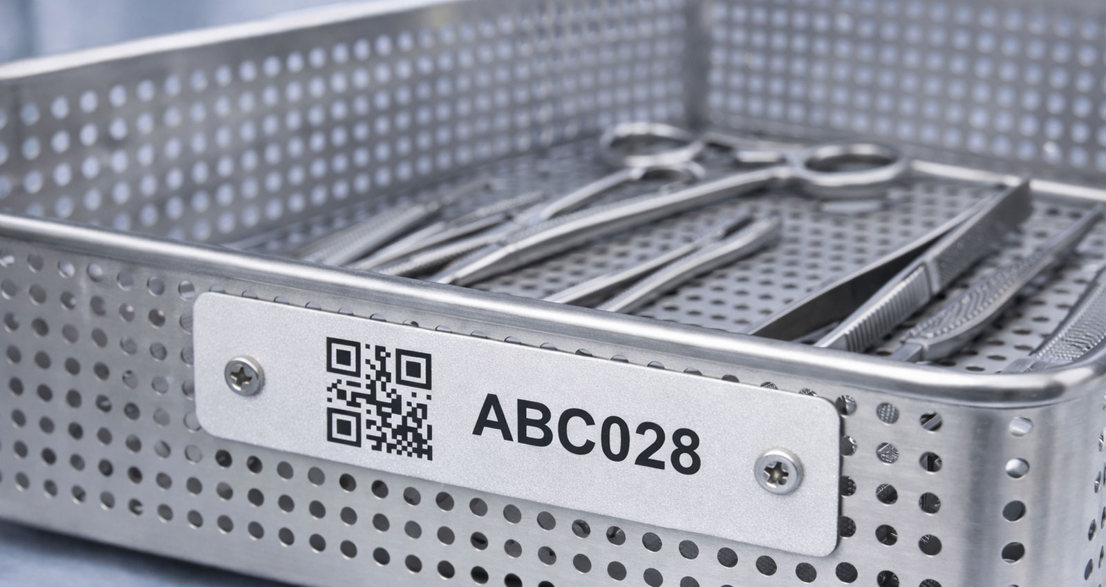 The label is mechanically fixed to metal trays, enabling barcode management throughout the entire workflow—from surgical preparation and sterilization to reuse.